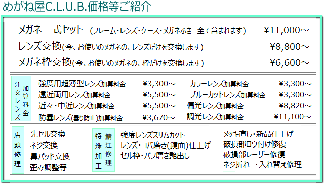 ■店内は、フレーム・レンズ・ケース付のセット価格¥11,000(税込)からご用意しております